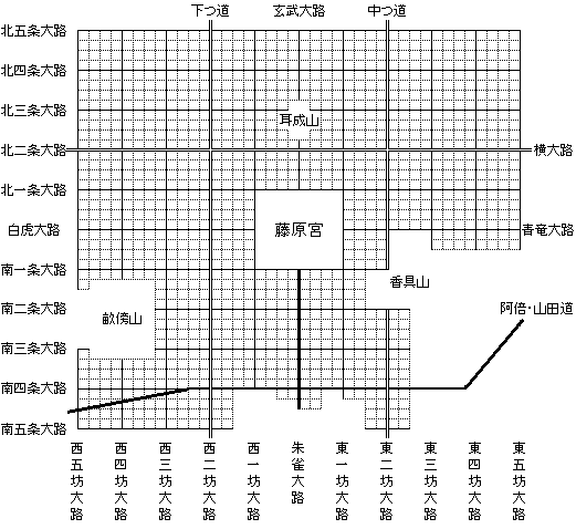Plan approximatif de la capitale de Fujiwara kyo, batie sur le modèle chinois en 694.