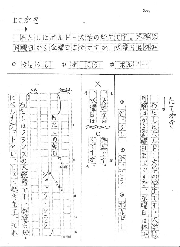 4)En écriture verticale, mettre la ponctuation et les petits kanas (sokuon, petit yo etc) en haut à droite des cases. En écriture horizontale, les mettre en bas à gauche.