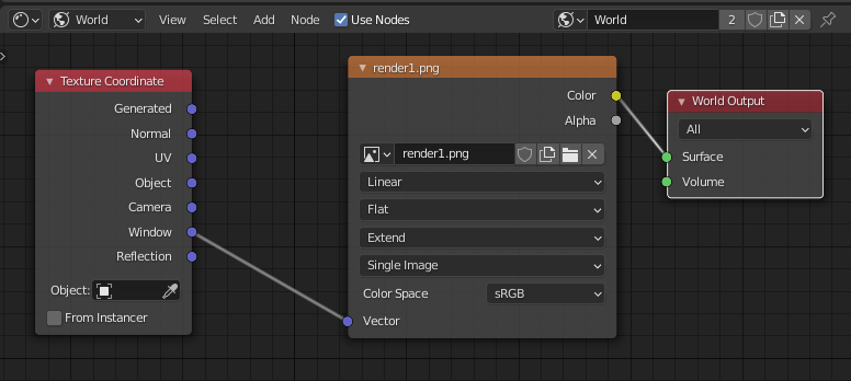 Après 2.8 avec des nodes : selectionner World dans les nodes puis texture coordinate (window)->image texture(linear flat extend)->world output.