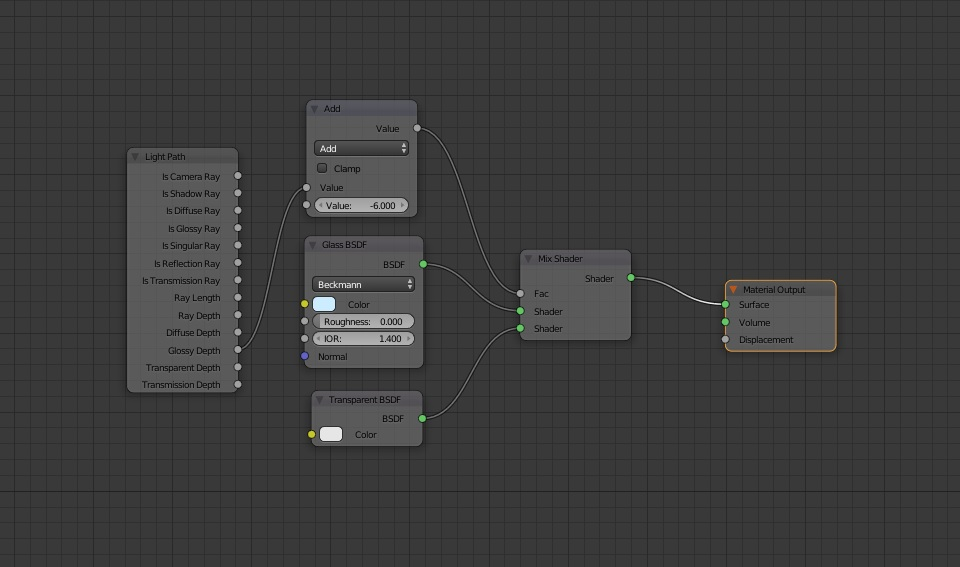 un node Light Path avec son glossy depth->add value d'un node math et value -6 (à tester de -3 à -200 selon le moteur de rendu)->fac d'un nod mix shader. Et on y met 2 shader, celui de verre et un transparent couleur blanche.