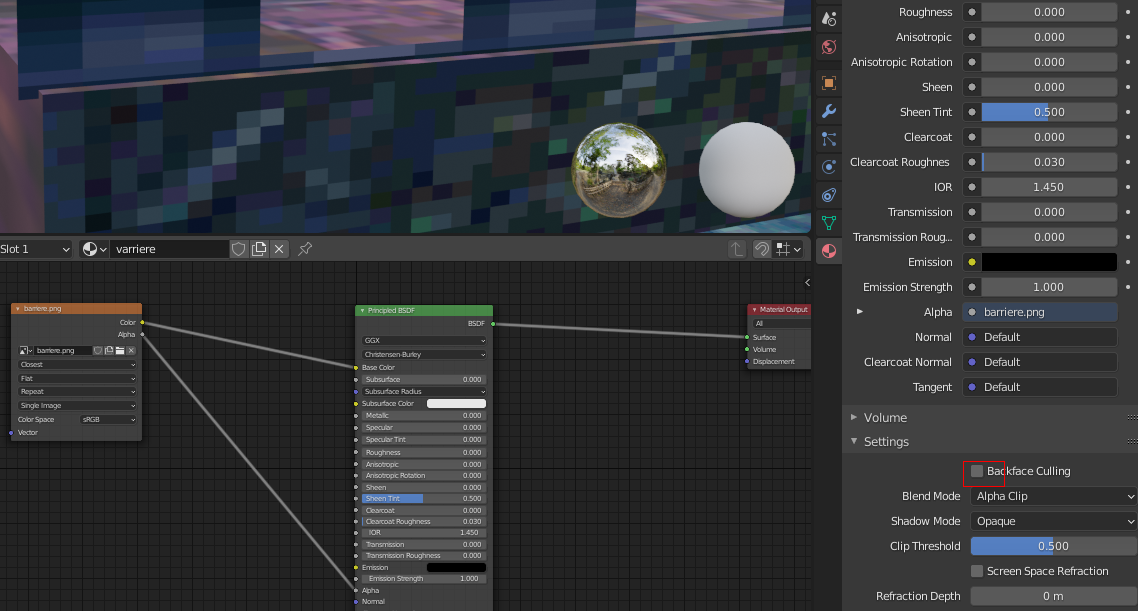 Pour avoir un plane affichant une image transparente, ajouter une texture, principled BSDF, couleur choisir image, sélectionner l'image, dans les nodes brancher l'alpha sur l'alpha et décocher backface culling et se mettre en alpha clip.