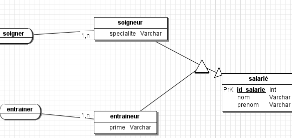 -Un triangle vide indique que les entités qui héritent peuvent fusionner et qu'il en existe potentiellement d'autres. Un salarié peut être soignant OU entraineur et il y a éventuellement d'autres types de salariés.