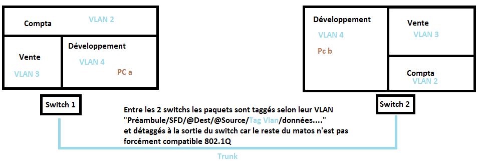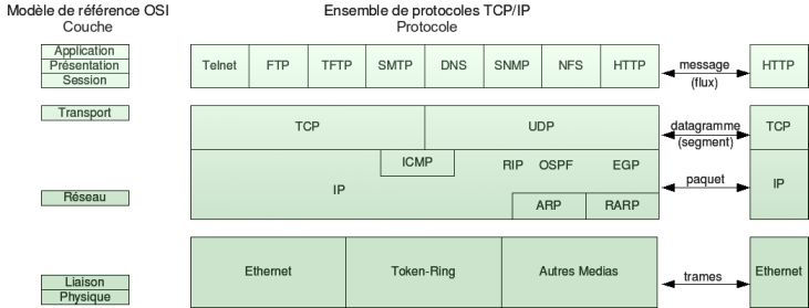 Protocoles | ⇒ | Les "règles", "langages" utilisés. Il y a différents niveau de protocoles qui s'emboitent entre eux. Par exemple, on peut avoir un protocole pour que 2 machines se reconnaissent (Ethernet) + un protocole qui demandera un accusé de réception (TCP) + un protocole affichant une page web (HTTP).
