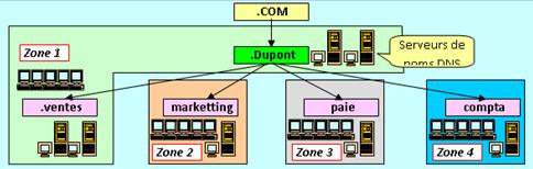 Une zone DNS permet de gérer ces enfants : mail.test.com, www.test.com, chat.test.com sont sur le domaine test.com. Elle permet aussi d'indiquer le(s) serveur(s) de mail (on indique leurs priorités les uns par rapport aux autres), l'email de l'administrateur. C'est un fichier texte qui contient des informations sur un domaine, tout ou une partie des noms et adresses des PC du réseau. On peut diviser cette base de donnée en plusieurs zones stockées sur plusieurs serveurs dns. Une zone doit englober un espace de nom de domaines contigu (test.local, compta.test.local).