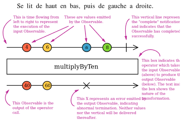 Observable : représente la source d'une collection de future valeurs ou d'évènement. C'est un flux qui émet des valeurs (exemple : pourcentage de quelque chose mis à jour chaque seconde). Il peut aussi émettre une fin de flux/une erreur.