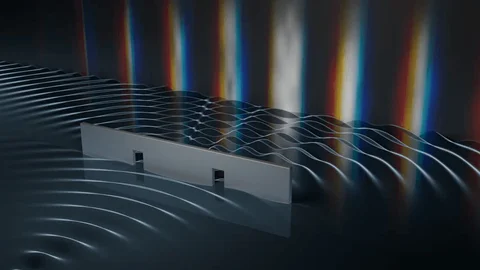 1) Deux fentes. || || On y fait passer des "ondes". En passant dans les trous ça les perturbe et ça fait des sortes de traits.