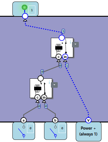 Donc si S1 est activé ET S2 est activé, de l'énergie sort du 1er relai... et ça va désactiver l'interrupteur du 2e relai.